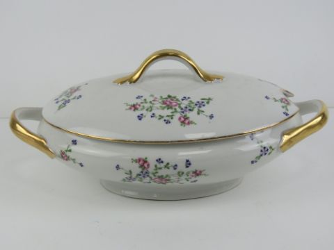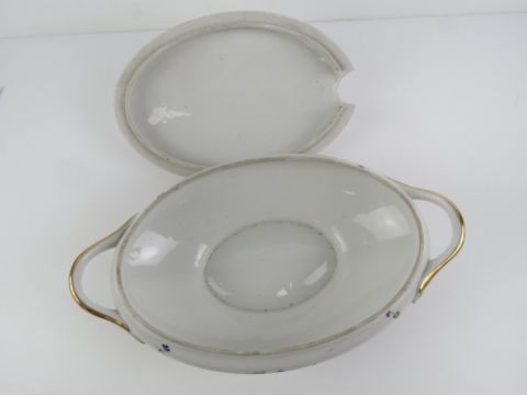 A French lidded turn having white ground with delicate pink and blue floral decoration upon, gilded handles, 37cm wide.