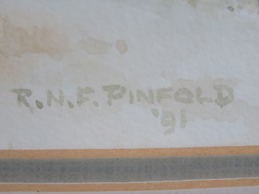 Watercolour; 'The Old Post Office, Lyndon, Rutland', country lane with thatched cottage, trees and skies beyond. Signer lower left R N F Pinfold (19)91. 33.5 x 25cm, framed and mounted.