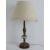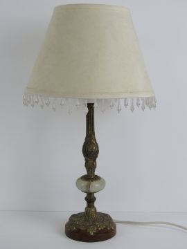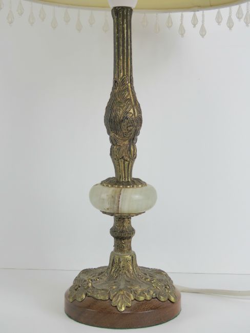 An onyx and brass lamp base complete with beaded shade, 45cm total height.