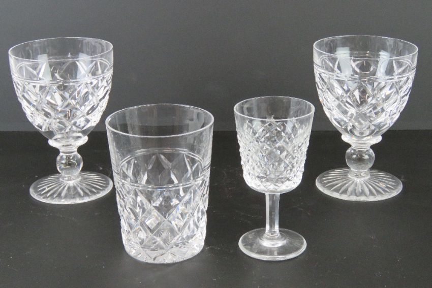 A pair of Stuart Crystal stemmed glasses (12.5cm high) together with matching cut glass tumbler (10cm high). Also a Waterford Crystal liqueur glass (11cm high). Four items.