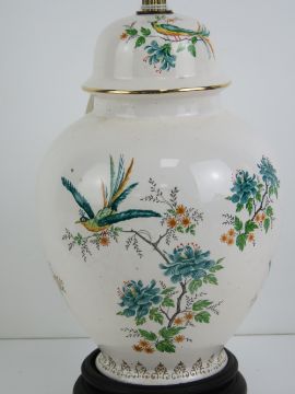 A ceramic lamp base in the style of a ginger jar with cover, having white ground with colourful birds upon, 30cm high inc fitting.