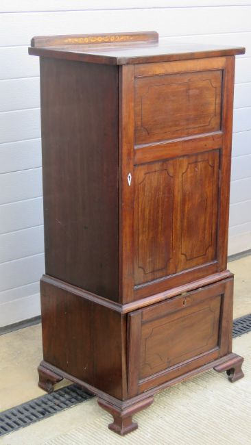 An Edwardian gramophone and music cabinet having twin slide shelves with fall front compartment under, floral inlay to under rail, 57 x 43cm, 123cm high.