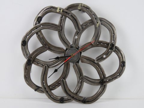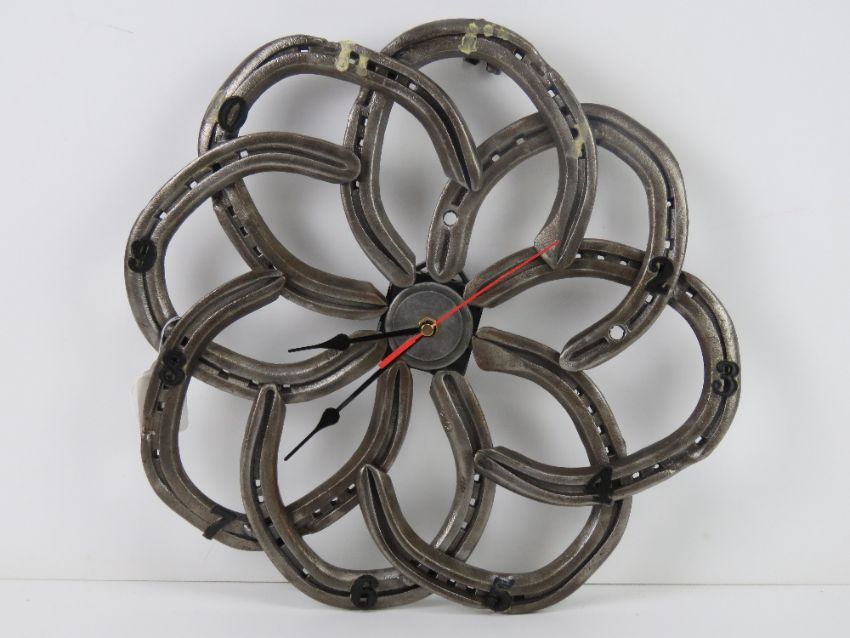 A wall clock formed from eight horseshoes and having central quartz movement, slightly a/f, numbers at top deficient.