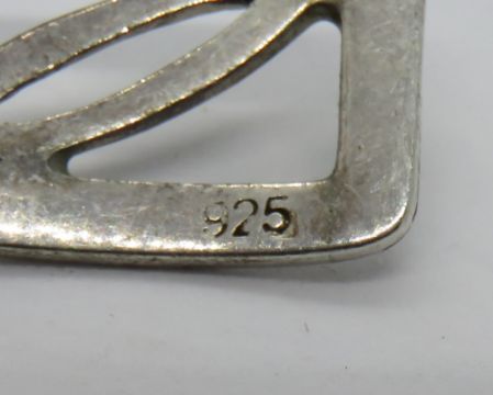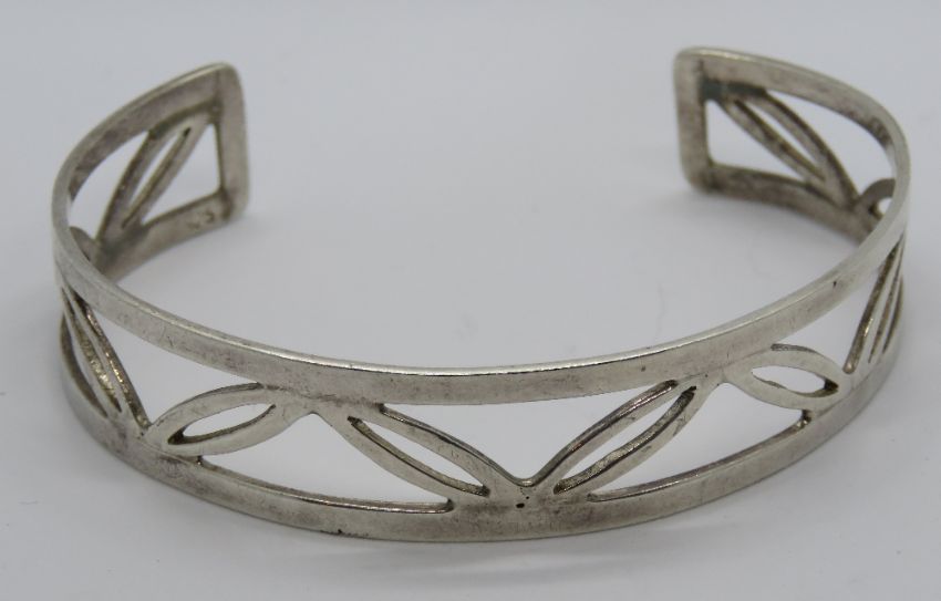 A HM silver bangle having open leaf pattern, 15mm wide, hallmarked 925 and further stamped 925.