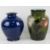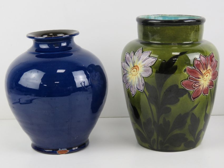 Two pottery vases; blue vase marked C H Brannam, Barum to base, 19cm high slightly a/f, the other in green ground with tube lined flowers upon, indistinct marks to base, 21cm high.