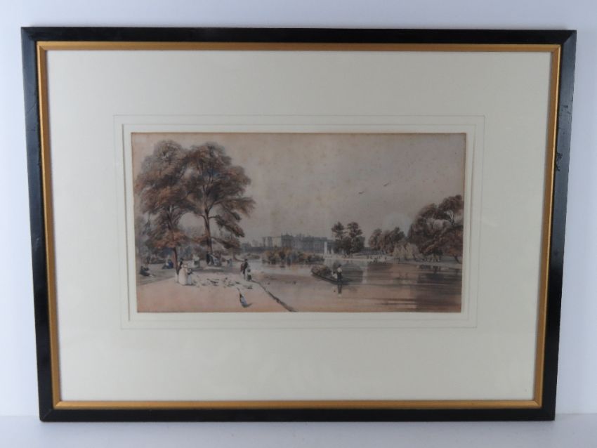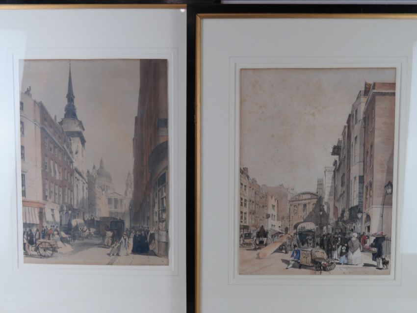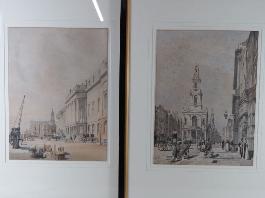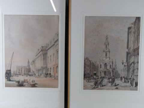 Hand coloured engravings of London; St Pauls from Ludgate Hill, Buckingham Palace from St James Park, entry to The Starnd from Charring Cross, Temple Bar from The Strand, The Horse Guards from St James Park, The Custom House, Regent Street looking towards The Quadrant, The Strand, and unknown London Chapel. Nine prints, each 31 x 42cm, in matching ebonised frames.