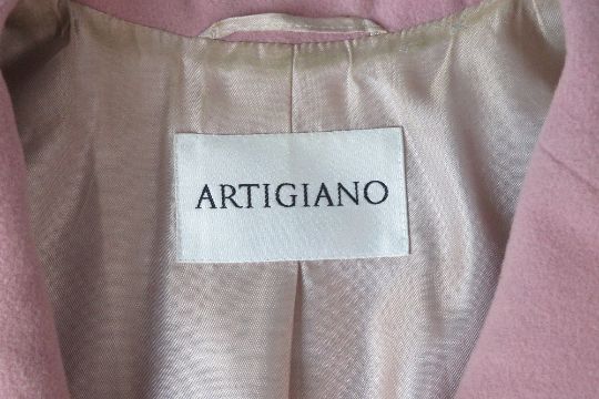 A blush pink jacket, 89% wool & 8% cashmere, made by Artigiano, UK size 16. Approx measurements; 42" chest, 27 1/2" length at back inc collar, 17" sleeve length underarm.