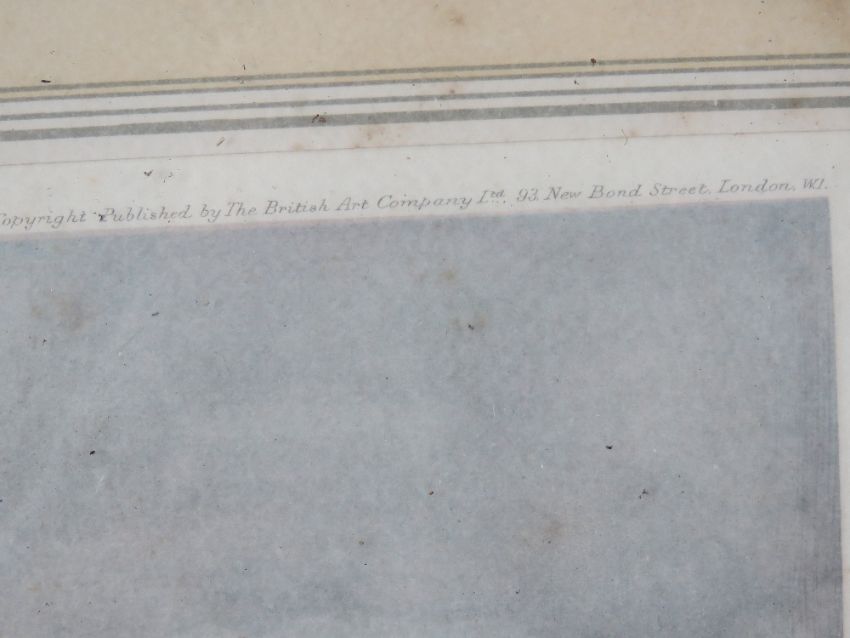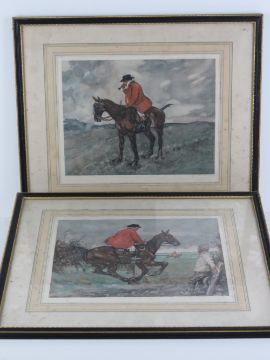 Coloured print; portly huntsman on galloping Chestnut, together with another print, portly huntsman calling to hounds, published by The British Art Company, 33 x 38cm each. A pair in Hogarth frames.