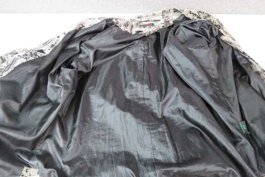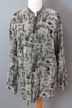 Ladies oriental pattern jacket by Kenki, dry clean only label within. Approx measurements; 47" chest, 32 3/4" length at back inc mandarin collar, 18 3/4" sleeve length underarm.