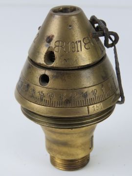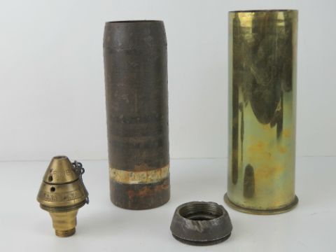 An inert WWI Minewaffer 75mm shell, dated 1917 on casing with fuse also dated 1917. 47cm in length.