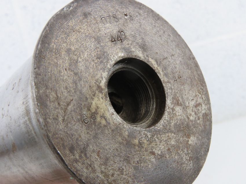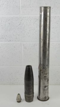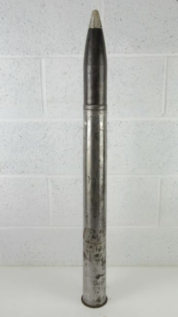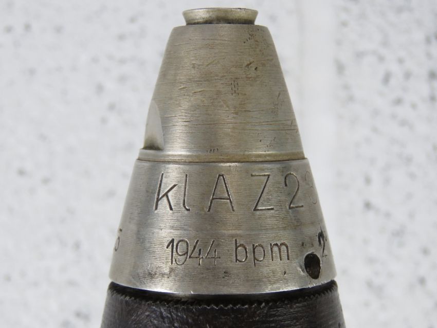 An inert WWII German 7.5cm Pak40 shell, dated 1944 with makers marked bzs, the head is dated 1944 and German marked, the fuse is dated 1944 and German marked. 100cm high.