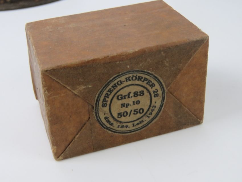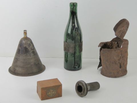 A WWII German relic cyclon B container, magnetic mine lower, mine detonator, molotov cocktail bottle and a dummy C4 packet.