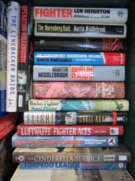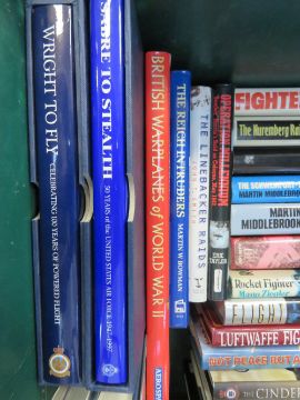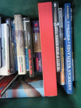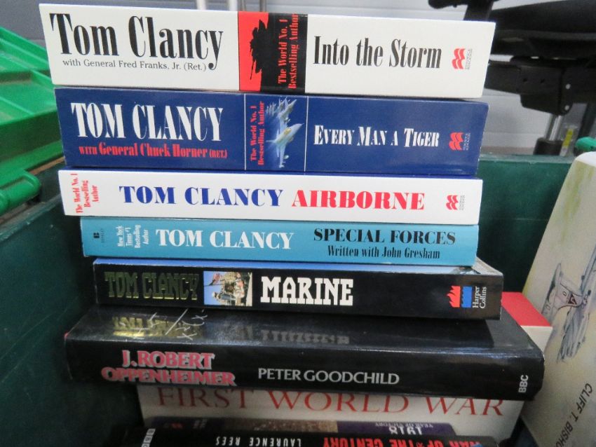 A box containing a quantity of assorted military and aviation themed books. Including a number of Tom Clancy novels.