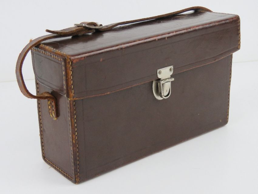 A WWII 1940s British camera, in leather case, made by Pathe "H", with instructions.