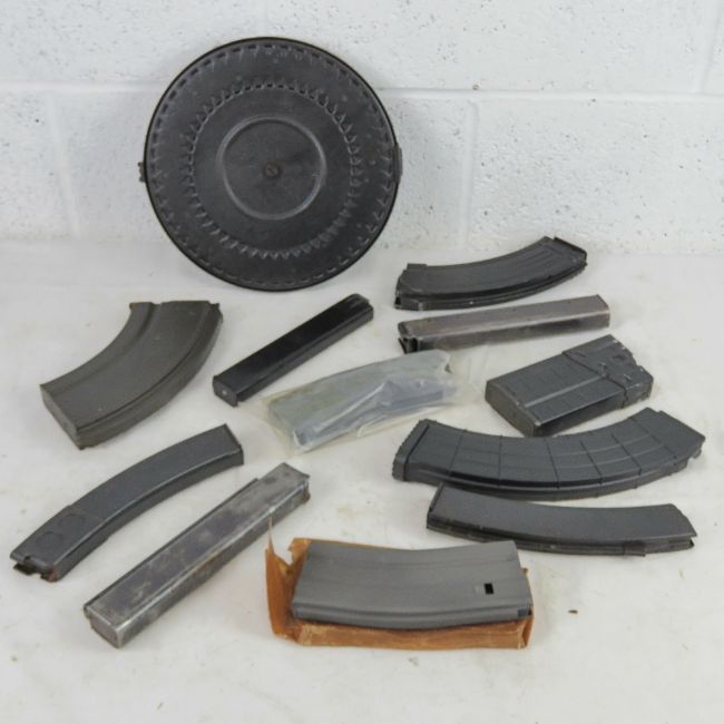 Twelve magazines; M16, DP28, AK , G3, Bren, Thompson, M56, and Madsen.