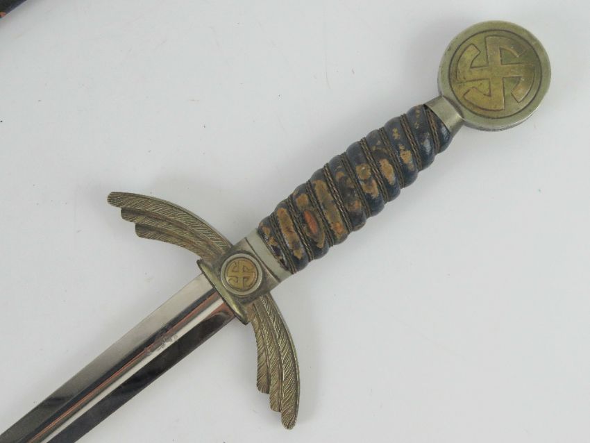 A WWII German Luftwaffe Officers dress sword having fullered blade marked ASMF Solingen, wing form cross guard, wire bound leather grip, the circular pommel with swastika insignia, blade 71.5cm in length, with scabbard.