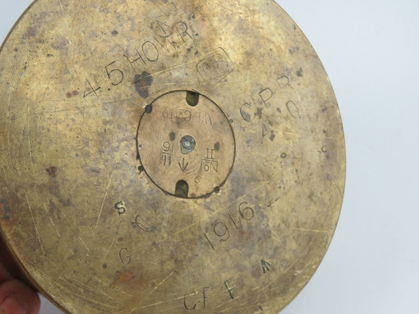 A WWI British 4.5cm Howitzer shell with head, dated 1916.