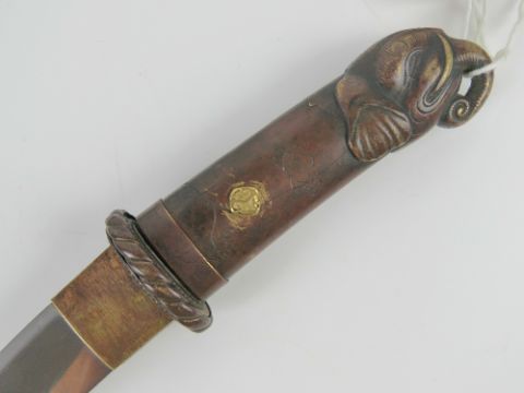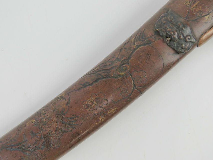 A Meiji period Tanto one piece oil tempered blade, 8 3/4 inches or just over 22cm, overall length is 16.5 inch with two Horimono of male dragons, all metal mounts copper and brass with line engraving of trees and blossom and birds, remains of Gilt highlights, with stylised elephants head Kashira, signed in Kaisho Kanji one character which can be read in a couple of ways? Riki see self + Hirose No173 in list or Kyo or Ku = (9th)no 173 + 1023 list. circa 1885.