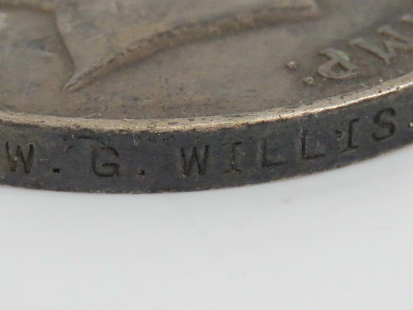 A framed montage of medals including 1939-45 Star, Africa Star, Italy Star, France and Germany Star, Service medal, RASC cloth badge and five other cloth badges, also three assorted bars. Together with a 1914-18 service medal 197434 DVR W.G. Willis RA, another 1939-45 star, a Royal Army Service Corps cap badge and a quatrefoil cap badge.