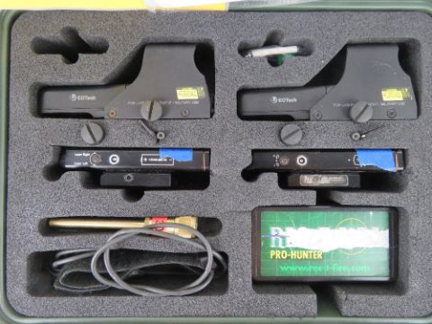 A day/night weapon sight kit type A- MK44 (M323/ GPMG in protective case including; two Eotech sights, two Leica twin beam lasers, two triggers (cable length 400mm), four Leica twin beam filter caps, an extension rod, pro hunter kit, GPMG zeroing chart and a Minigun zeroing chart, with instructions.
