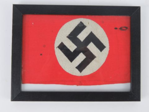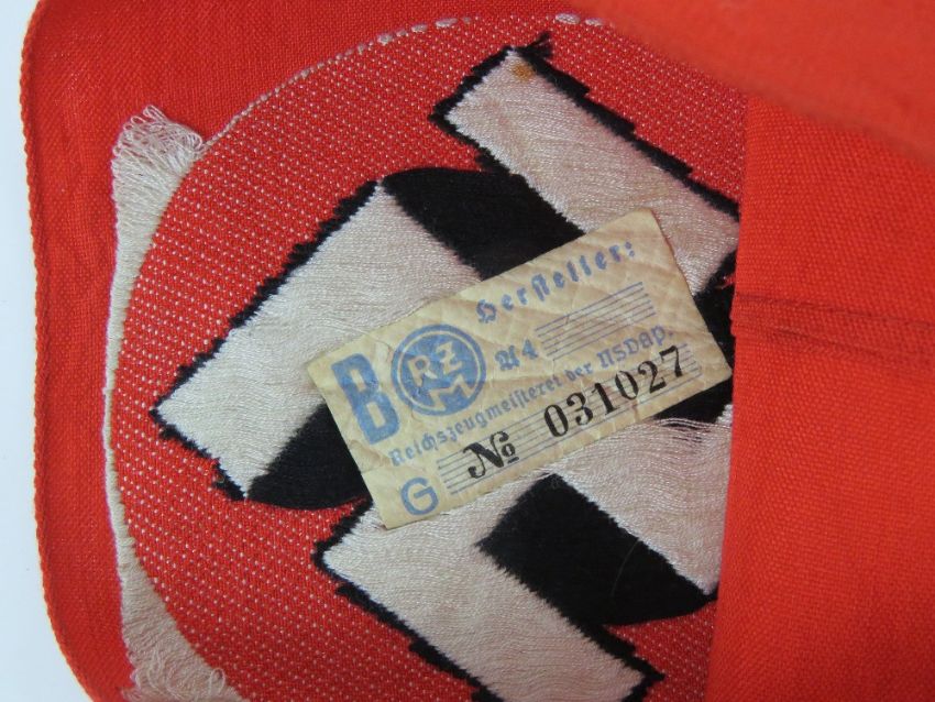 A WWII German Swastika arm band with RZM label, in frame.