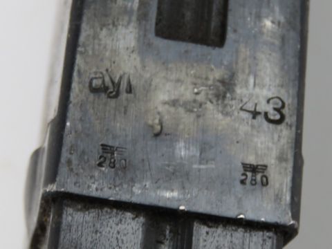 An MP38/ MP40 magazine dated 1943 with AYR makers mark and further German marks upon.