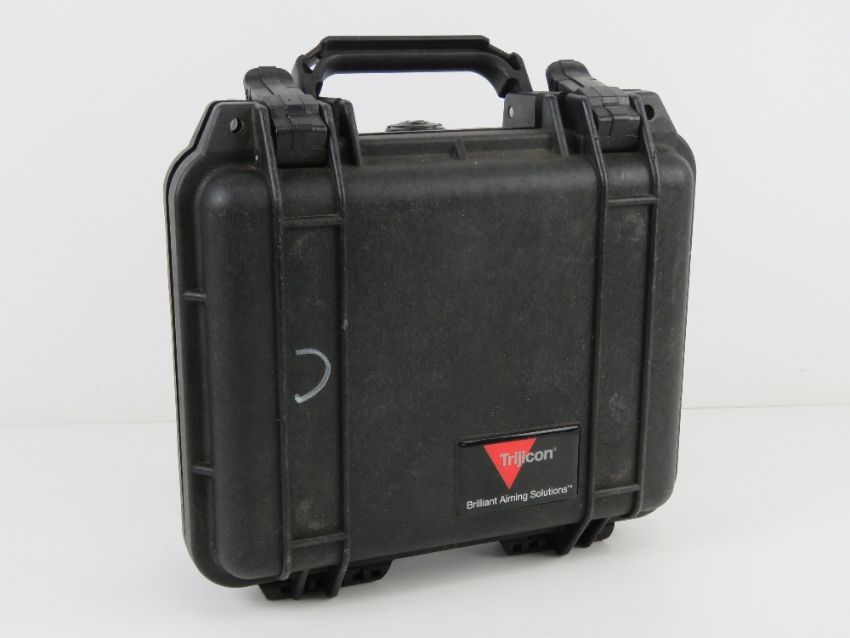 A Trijicon Pelican case with accessories and foam, includes a locking lever.