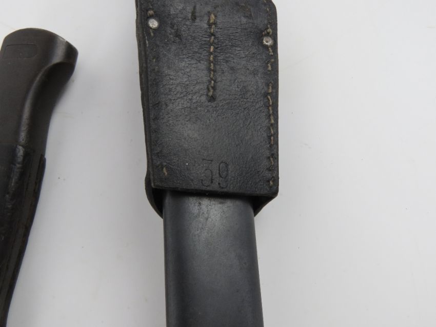 A K98 bayonet with scabbard and leather frog, wooden grips, German marks to the handle and one on the scabbard, frog dated 1941.