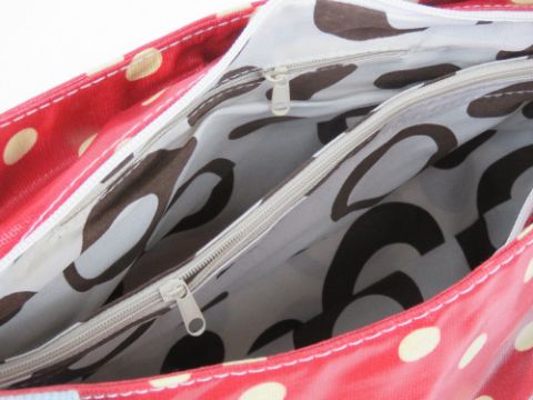 An 'as new' red polka dot handbag 49 x 23cm.