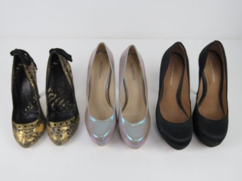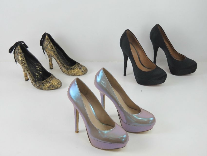 Three pairs of ladies heeled shoes inc black Kurt Geiger size 40, leopard print Irregular Choice size 38 and pearlescent Call it Spring US size 8.