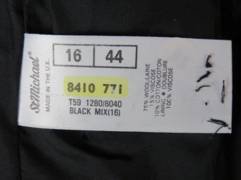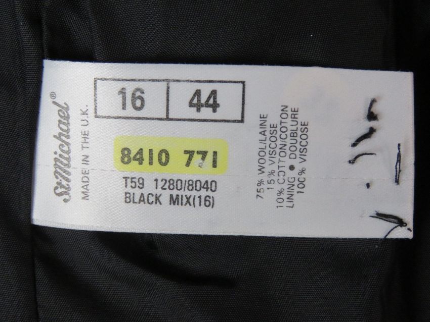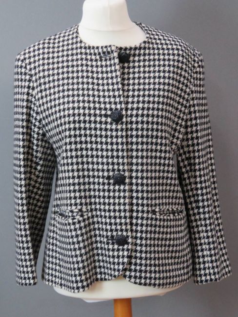 A hounds tooth pattern ladies jacket, 75% wool, UK size 16. Approx measurements; 42" chest, 26" length at back inc collar, 15 1/4" sleeve length underarm. Slightly a/f, signs of use, could do with a dry clean.