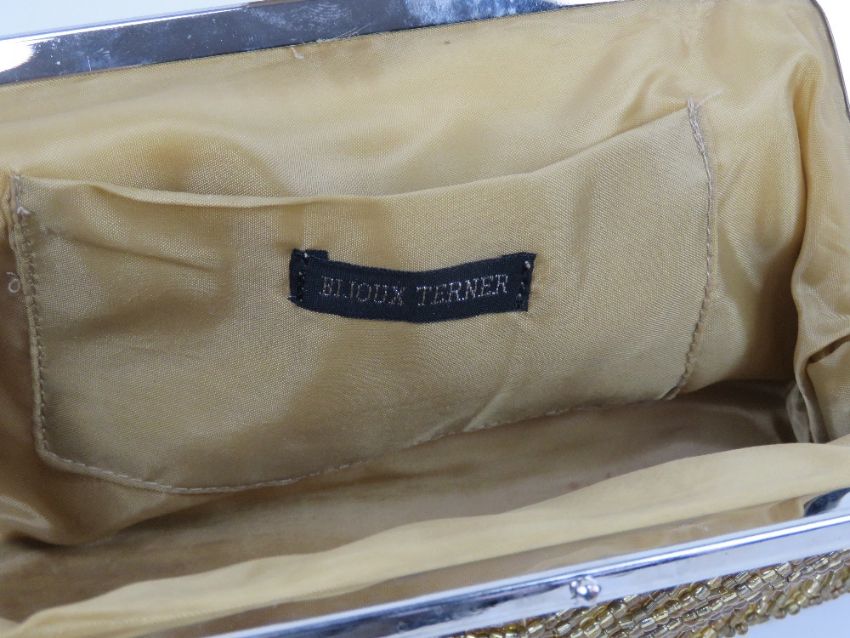 Two ladies evening bags one beaded gold colour the other purple floral.