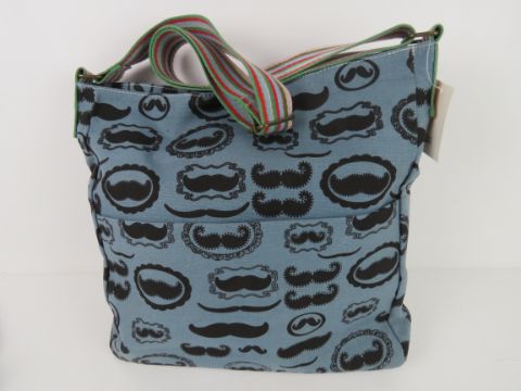 A fabric tote bag having mustache pattern in blue 'as new', approx 38 x 34cm.