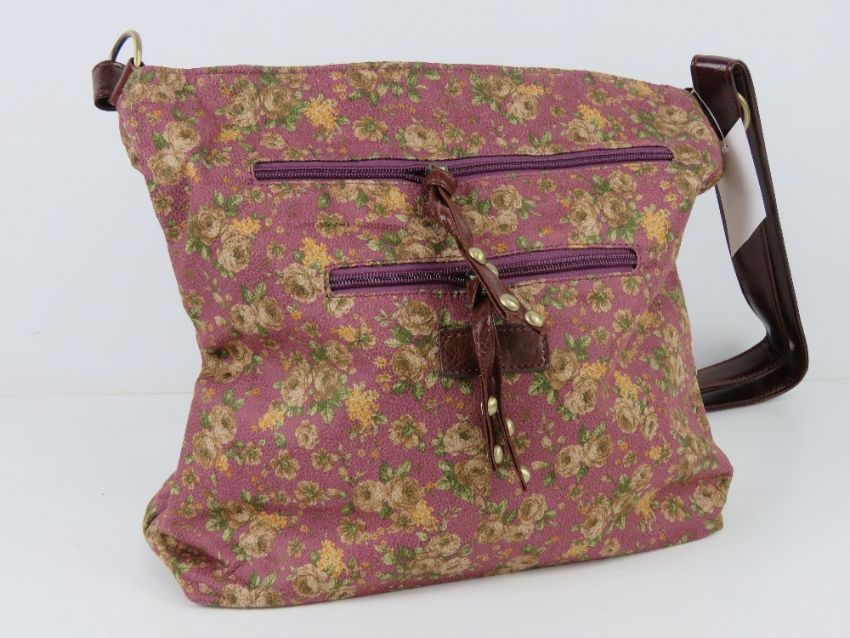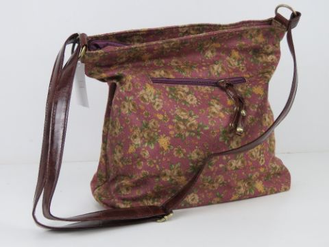 A 'as new' fabric tote bag having floral pattern on purple background 34 x 30cm.