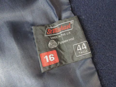 A ladies navy blue 100% pure new wool jacket, UK size 16, slightly a/f to button and slight damage to collar at back. Approx measurements; 42" chest, 26 1/2" length at back inc collar, 17" sleeve length underarm.