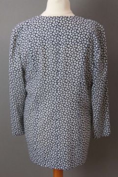 Frank Usher; a light floral jacket having tie waist in navy and white, UK size 12. Approx measurements; 42" chest, 30 1/2" length at back, 16 1/2" sleeve length underarm.