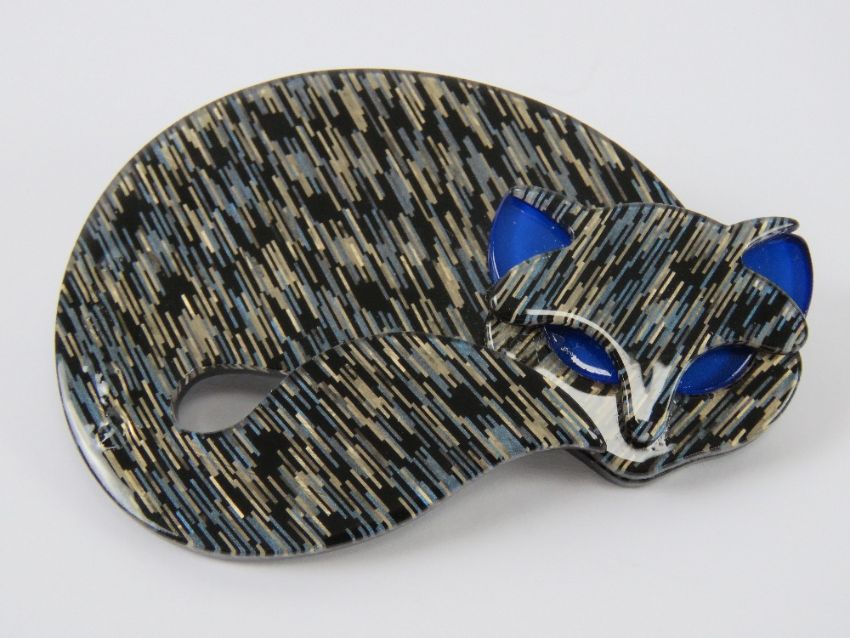 An overlaid plastic brooch in the style of Lea Stein in the form of a sleeping cat, 6cm wide.