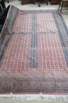 A large four panel red ground rug having geometric design to border, 294 x 190cm, slightly a/f. Together with a small geometric design rug, 144 x 102cm, fringe a/f. Two items.
