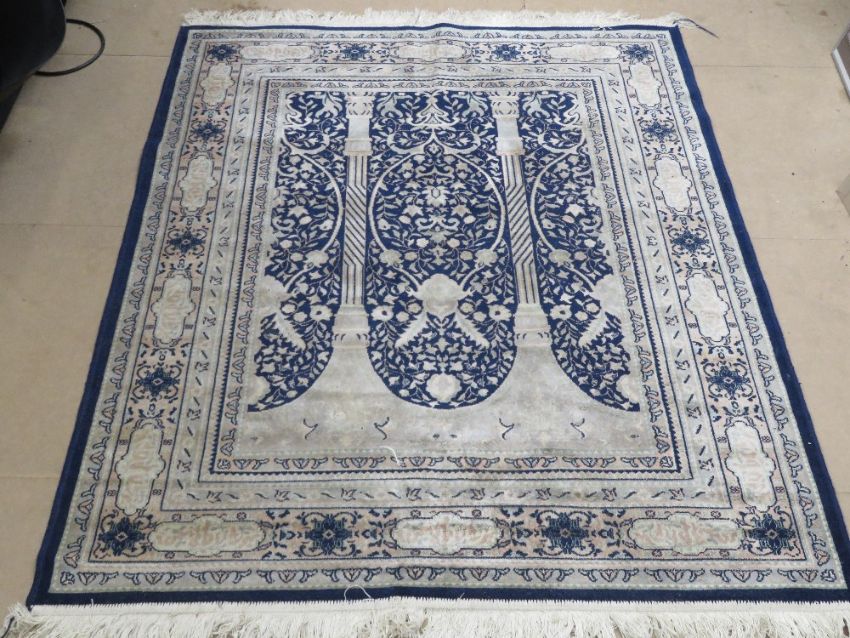 A silk rug in blue ground having Architectural design upon, 170 x 126cm.