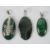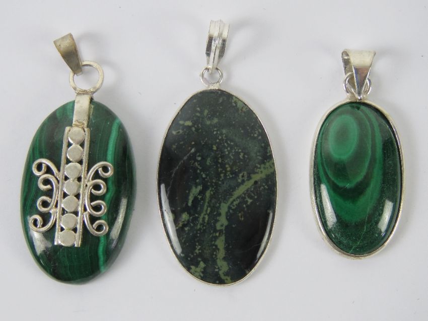 Two malachite pendants each with white metal setting stamped 925, together with another green hardstone pendant, also stamped 925. 4.4-5.1cm in length inc bale. Three items.