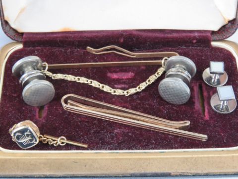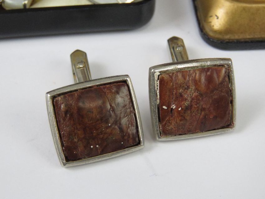 An 'Ascot' mother of pearl tie clip, together with a set of mother of pearl cufflinks, various cufflinks and shirt studs, and two other tie clips. Within two vintage boxes.