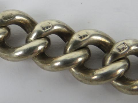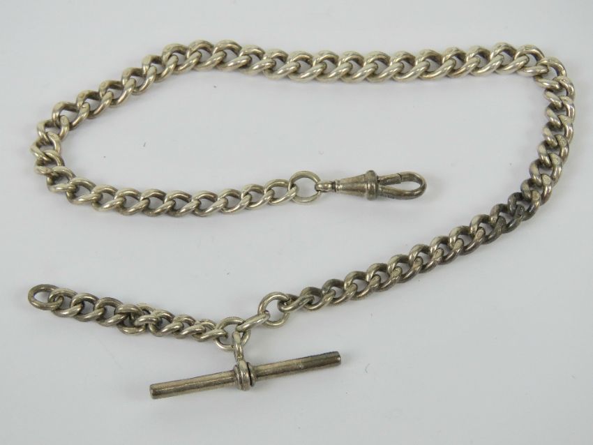 A HM silver watch chain having clasp and T-bar, hallmarks throughout, 37cm in length, 1.43ozt.