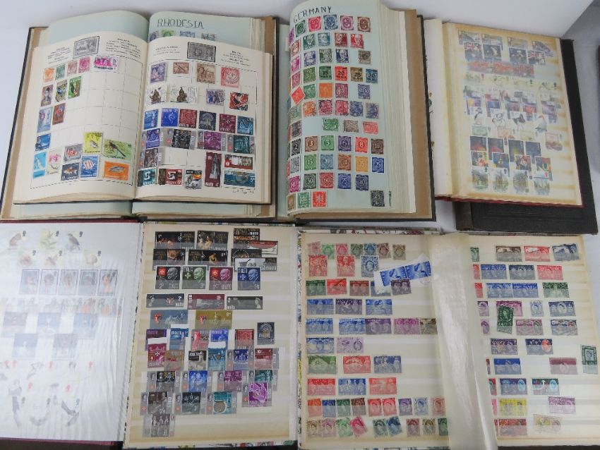 Stamps; four loose stamp albums, mostly 20thC, some Victorian noted inc Penny Red, Two Pence Blue etc.
