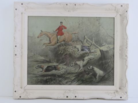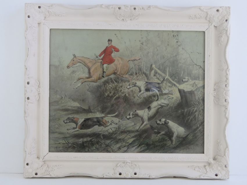Basil Nightingale (British, 1864-1940) watercolour; huntsman vaulting a ditch, hounds beside, signed lower middle right Basil Nightingale 1889, 39 x 49cm.