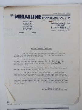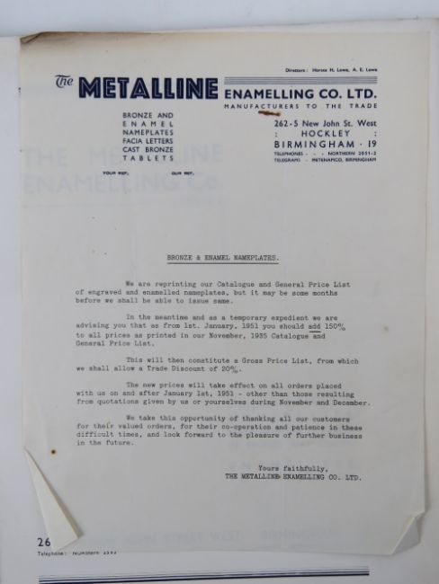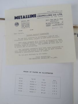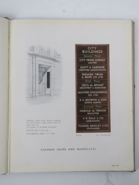 Book; 'Bronze and Enamel, Engraved and Cast Name Plates, Tablets, Arms and Facia Letters' complete with original metaline 'bronze plastic nameplates price list' dated May 1951.