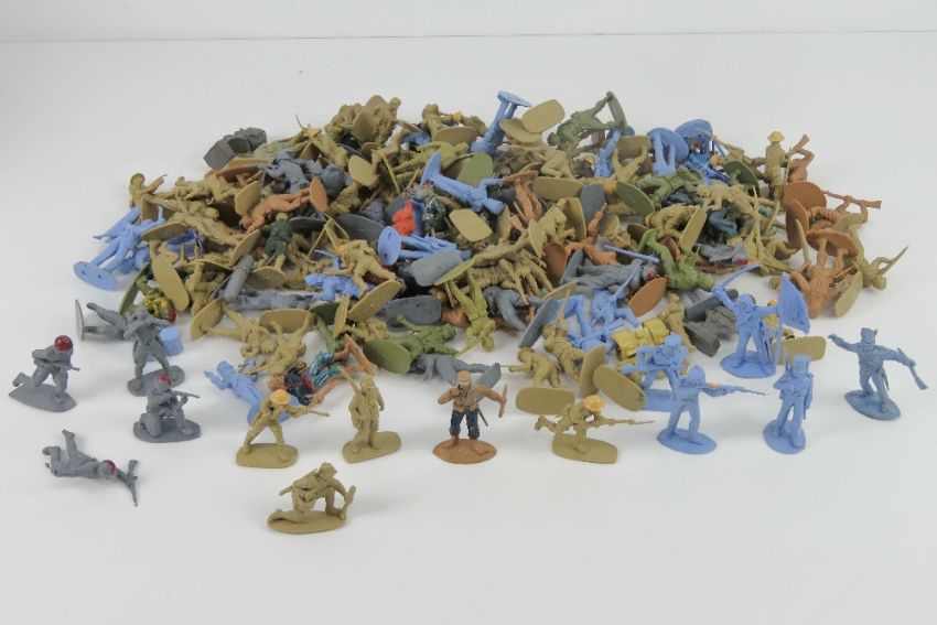 A quantity of plastic army figurines being British, German and Russian armies in WWI style uniforms.