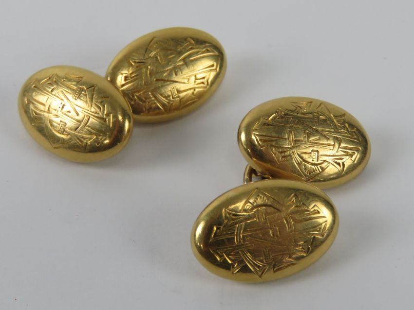 A pair of 18ct gold cufflinks having gothis style monogram engraved to each side, stamped 18ct with makers mark, 8.8g.