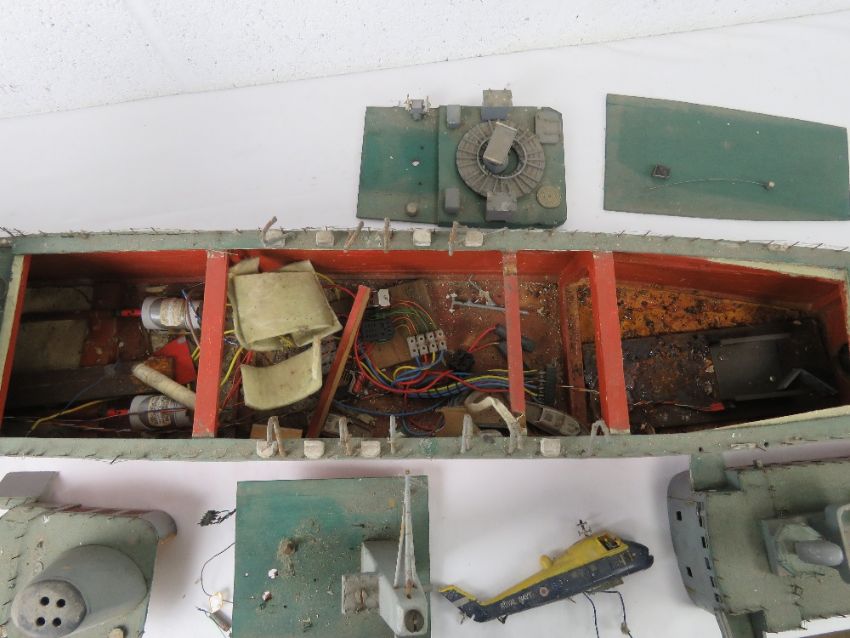A scratch built scale model part finished vintage naval battleship of unknown class of wooden construction complete with twin propellers, rudder, deck mounted guns, chimney, etc. 170cm.