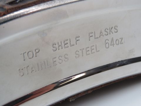 A 20th century novelty oversized hip flask by Top Shelf Flasks, stainless steel with faux-crocodile skin cover, 64 fl.oz capacity.