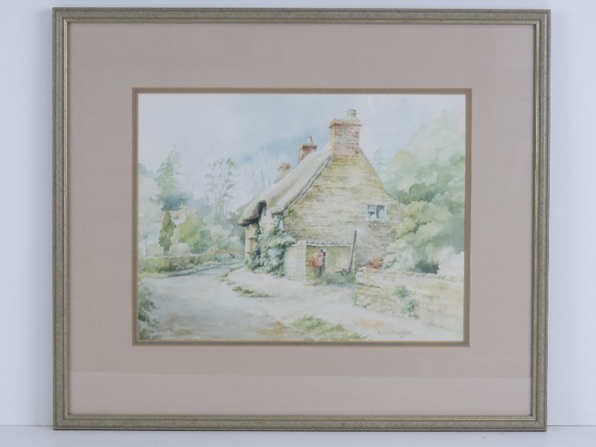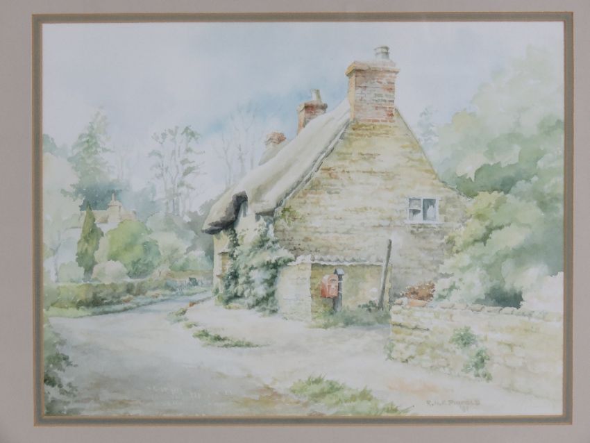 Watercolour; 'The Old Post Office, Lyndon, Rutland', country lane with thatched cottage, trees and skies beyond. Signer lower left R N F Pinfold (19)91. 33.5 x 25cm, framed and mounted.